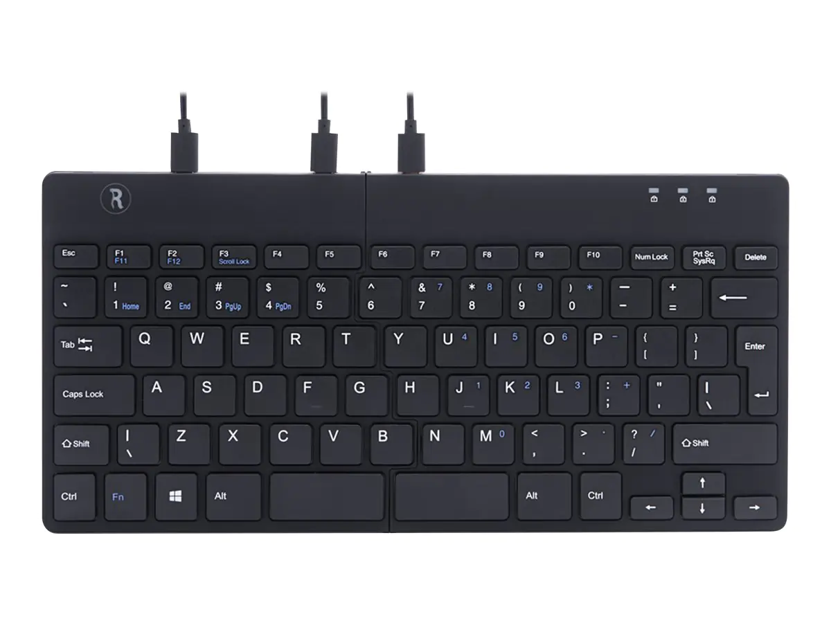 Das kompakte Design sorgt dafür, dass die Hände beim gleichzeitigen Gebrauch von Tastatur und Maus stets innerhalb der Schulterbreite bleiben. Die beiden Teile können in jede gewünschte Position gebracht werden. Dieses einzigartige Design vermeidet eine Reichbewegung des Arms und sorgt für eine natürliche, entspannte Position der Schulter, des Ellenbogens sowie des Handgelenks. Dank des leichten Tastenanschlags herrscht beim Tippen eine minimale Muskelspannung. Das dünne Design sorgt für eine entspannte, flache Haltung der Hände und Handgelenke beim Tippen. Die Tastatur ist leicht, und da sie aus zwei Teilen besteht, passt sie einfach in jede Laptoptasche.