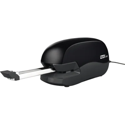 Kompaktes elektrisches Heftgerät für den Schreibtisch, die Rezeption oder zu Hause. Betrieb mit mitgeliefertem Netzadapter. Komfortables Heften mit einer Hand. Einfaches Befüllen des Klammermagazins von vorne.