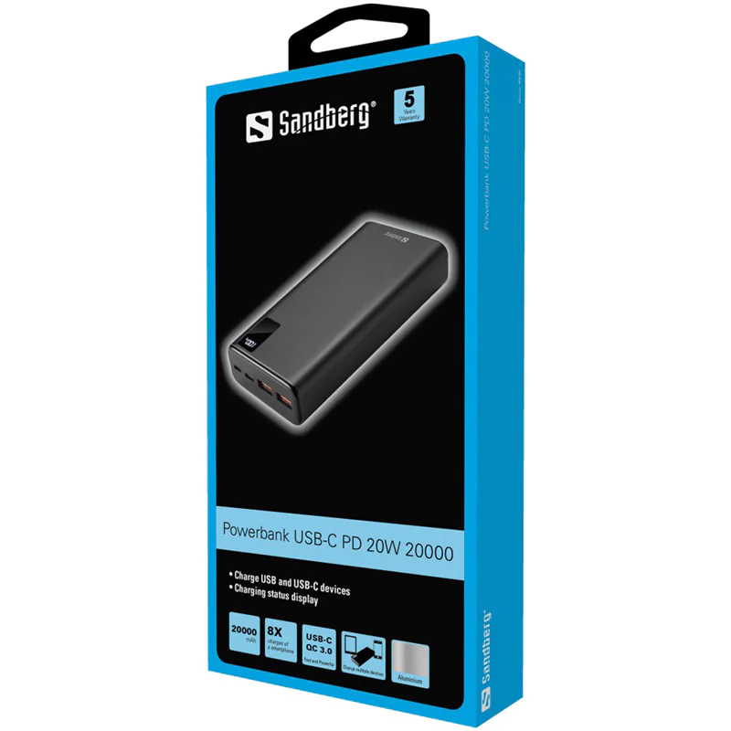 Sandberg - Powerbank - 20000 mAh - 74 Wh - 20 Watt - 3 A - PD, QC 3.0 - 3 Ausgabeanschlussstellen (2 x USB, USB-C)