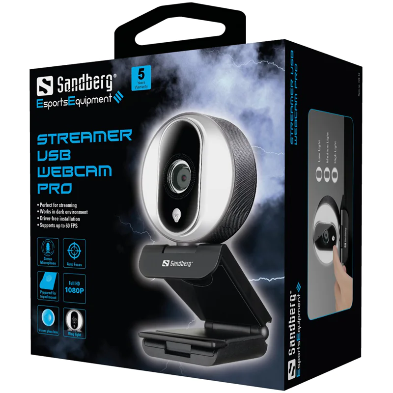 Sandberg Streamer USB Webcam Pro ist die perfekte Webcam für Streaming, Gaming oder auch Online-Unterhaltungen mit Ihren Freunden. Dank der 1080P Full HD-Auflösung dieser Kamera entstehen superscharfe Bilder mit 30 fps oder 60 fps bei einer Auflösung von 720P. Zudem bietet die Kamera großartige Funktionen wie Autofokus und automatische Lichtkorrektur. Die Kamera wird in einer beleuchteten Zone platziert, die Hintergrundbeleuchtung ist durch Berührung anpassbar. Ein Stereomikrofon, welches Rauschen reduziert, ist in die Kamera integriert und sorgt für eine optimale Sprachwiedergabe.