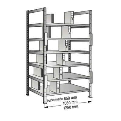 Steckregal im Baukastensystem. Optimale Raumnutzung durch verschiedene Breiten und Höhen. Seitlicher Herausfallschutz für Ordner durch neue Traversen. Perfekte Ordner-Passgenauigkeit. Geringer Montageaufwand. Alle Kanten gerundet, keine Verletzungsgefahr. Regalaussteifung durch Kreuzstreben in jedem zweiten Regalfeld.