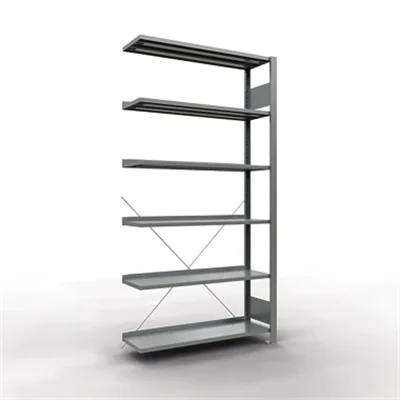 Fachbodenregal, einseitig nutzbar. Aussteifung durch Kreuzstrebe. Einfaches Ausrichten des Regals durch Spannschlösser an den Kreuzstreben.Ideal zum Aufbau von Regalzeilen vor Wänden und als Doppelregal Rücken an Rücken. Fachböden im Raster in der Höhe verstellbar. Geeignet zum Bau mehrstöckiger Regalanlagen. Schneller Aufbau durch ein faches Stecken der Fachböden.