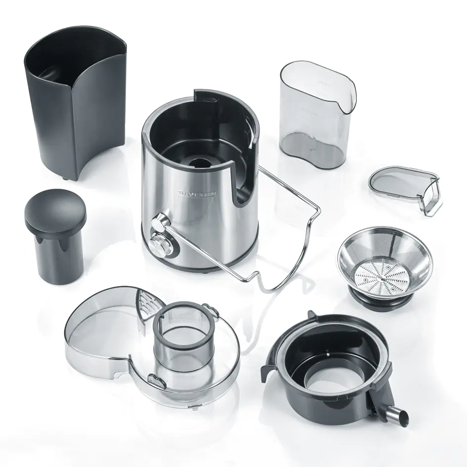 - Saftauffangbehälter aus BPA-freiem Kunststoff mit einer Kapazität von ca. 500 ml, inkl. Deckel zur Schaumtrennung