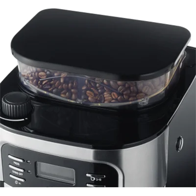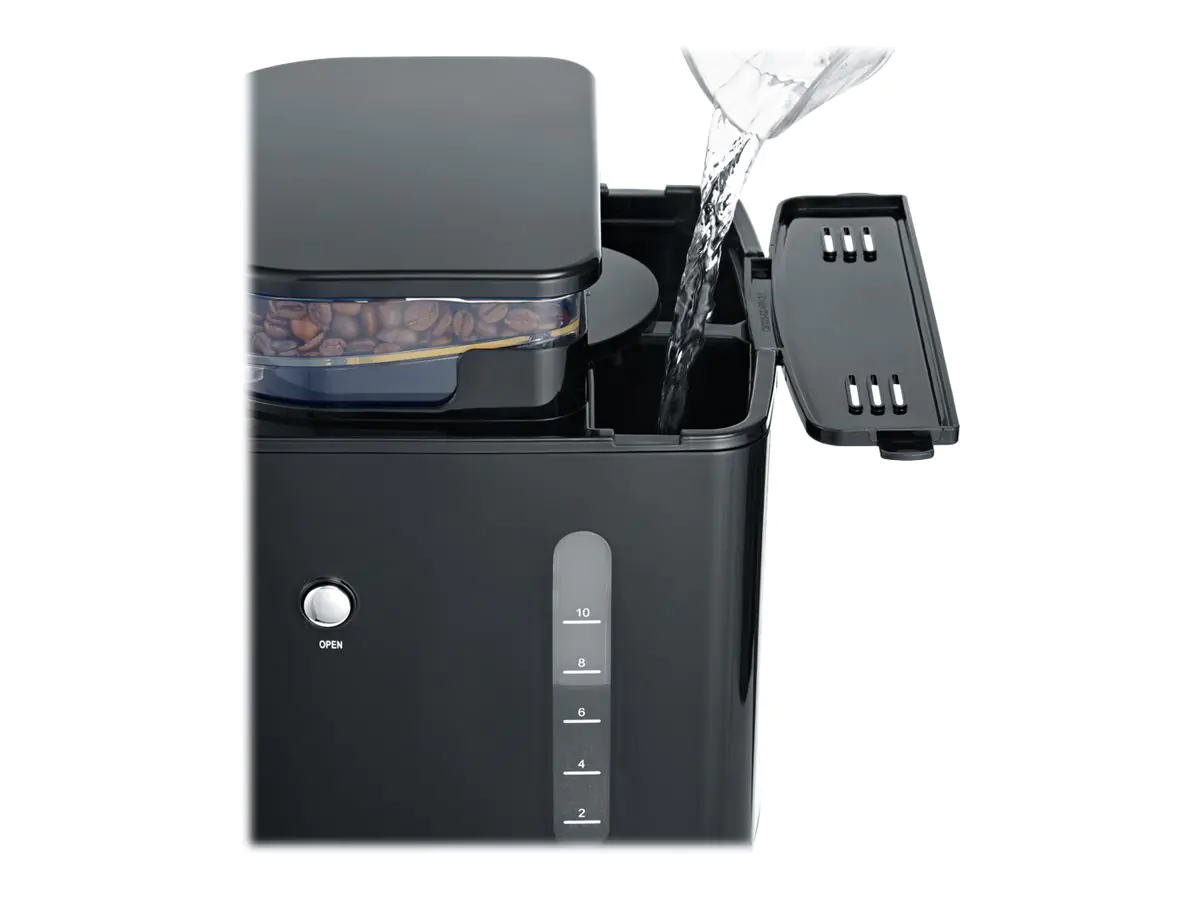 Kaffeeautomat mit integriertem Mahlwerk und hochwertigem Design. Mahlwerk-Deaktivierungsfunktion für vorgemahlenen Kaffee. Schwenkfilter mit herausnehmbarem Filtereinsatz 1 x 4 mit Tropfverschluss und zusätzlicher Permanentfilter. Aromawahl mit drei einstellbaren Aromastufen. Mahlgrad und Kaffeemenge einstellbar. Mit Warmhalteplatte und Wasserstandsanzeige.