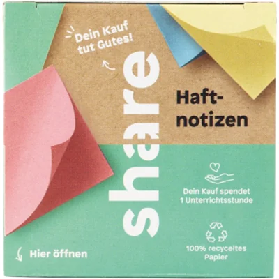 Eine Unterrichtsstunde spenden - Was bedeutet das genau? Mit deinem Kauf hilfst du uns, Kinder in Uganda zu unterstützen. Eine Spende bedeutet dabei viel mehr als nur eine Stunde Naturwissenschaften, Sprachen oder Mathematik. Es ist die Ausstattung eines Kindes mit notwendigen Materialien und die Möglichkeit, an einer Unterrichtsstunde teilzunehmen. Aber unsere Haftnotizblöcke sind nicht nur sozial, sondern setzen auch ein Zeichen für mehr Nachhaltigkeit: Sie bestehen aus recyceltem Papier und sind mit dem Blauen Engel ausgezeichnet. Statt in Plastik haben wir unsere Notizzettel in eine umweltfreundliche Faltschachtel gepackt und nutzen lösemittelfreien Kleber. Die Faltschachtel kann als stabile Storage Box für den Haftnotizblock verwendet werden.