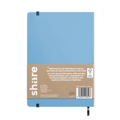 Seite für Seite gutes tun: Das Journal von share, ist ein kleiner Helfer mit großer Wirkung. Denn obwohl das Cover des Journals die Optik und Geschmeidigkeit von Leder hat, besteht es durch das Upcycling von Apfelschalen und -kernen zu mind. 35 % aus Apfelbestandteilen. So kann es guten Gewissens zur täglichen Organisation oder als Tagebuch genutzt werden. Und das Beste ist: Jedes Journal spendet eine Schulstunde für ein Schulkind und fördert damit Bildungsgerechtigkeit. Mit 32 perforierten Seiten. Das cremefarbene Papier besteht aus bis zu 15 % Apfelbestandteilen (Anteil kann prozessbedingt schwanken).