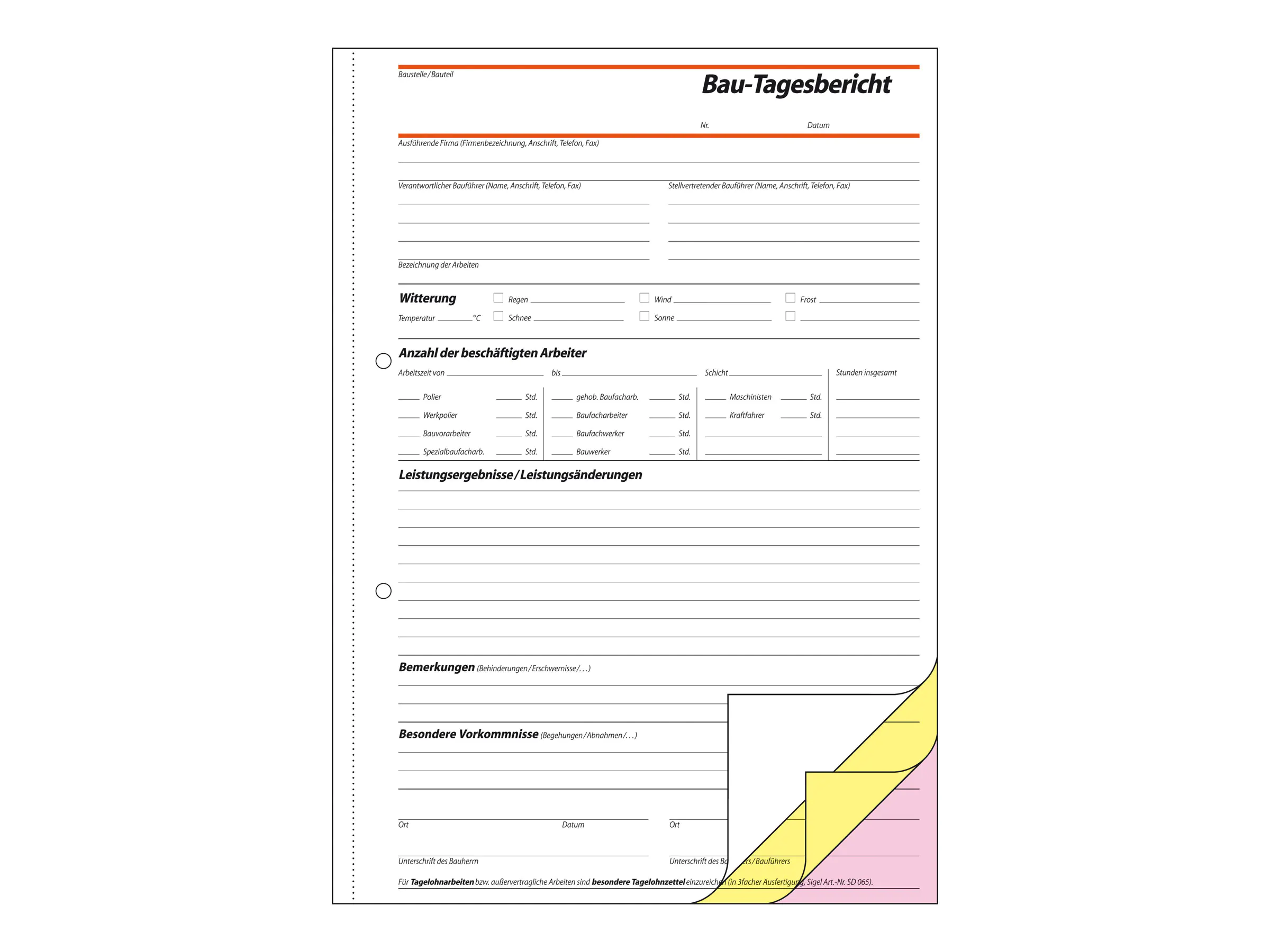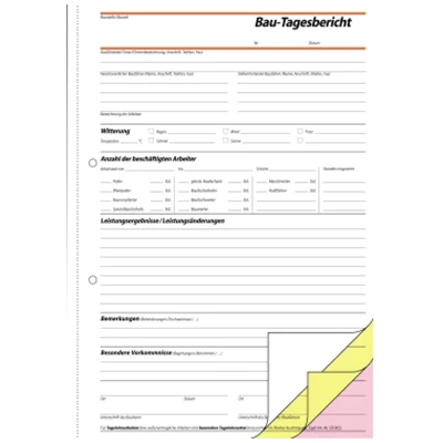Inkl. integrierter Schreibunterlage. Das Bautagebuch dient zum genauen Nachweis ausgeführter Bauleistungen, zur exakten Dokumentation von Witterung, Arbeiteranzahl, Arbeitsstunden und Leistungsergebnisse und entspricht den Anforderungen der Baubehörden.