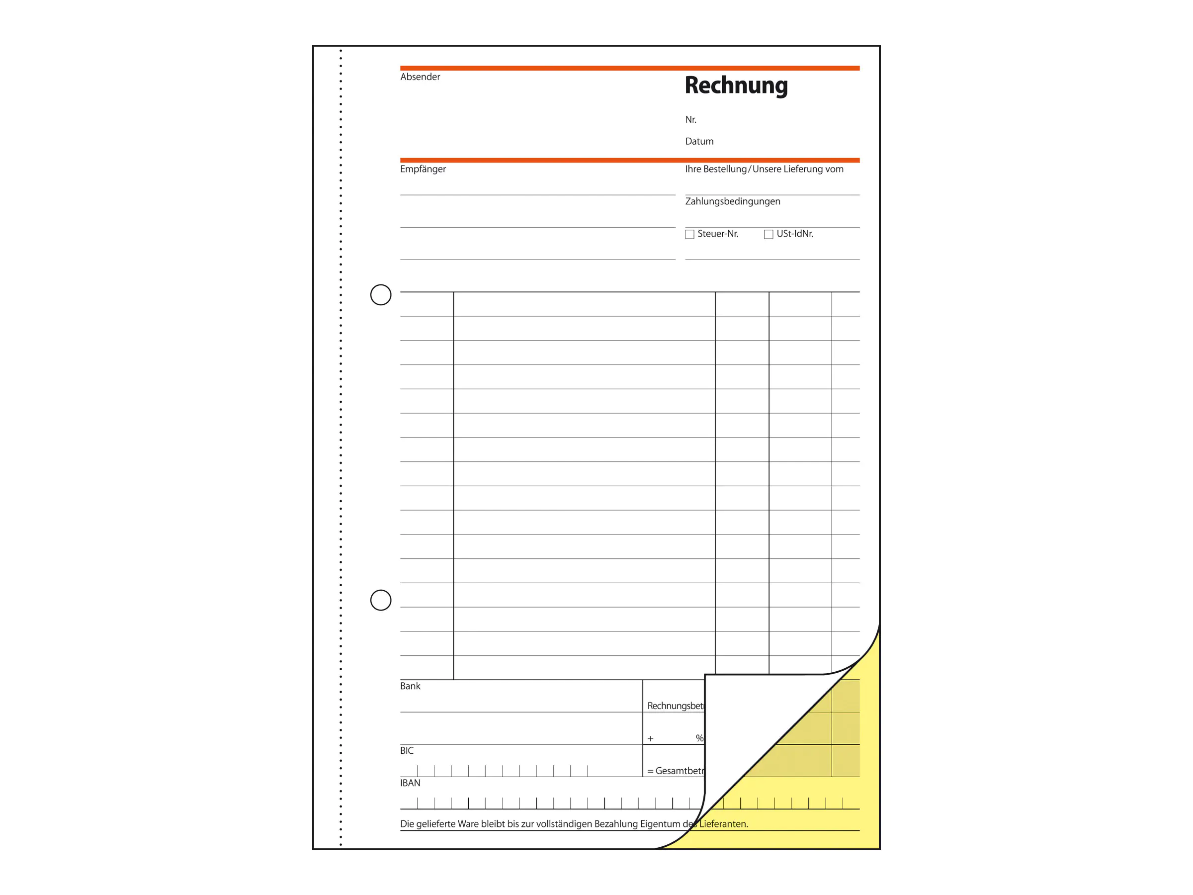 Mit allen erforderlichen Angaben wie z.B. IBAN/BIC, Steuernummer/USt-IdNr. und Rechnungsnummer. Eine Sicherheitsbindung macht das Formularbuch besonders stabil und haltbar.