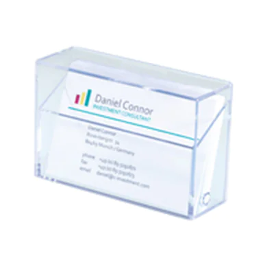 Glasklare Visitenkarten-Box praktischer Doppelfunktion: Im geschlossenen Zustand dient sie als sichere Aufbewahrungsbox und aufgeklappt als Aufsteller zur Präsentation der Visitenkarten.