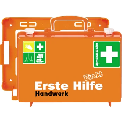 Eine klare Lösung für die individuellen Bedürfnisse in Ihrem Betrieb bietet das SÖHNGEN ® Programm Erste Hilfe DIREKT. Die Koffer der Serie Erste Hilfe DIREKT sind Erste-Hilfe-Koffer für kleinere Betriebe und Gruppen aus Verwaltung, Handwerk und Dienstleistung. Ausstattung zuzüglich Erste-Hilfe-Material nach berufsspezifischer Risikobewertung. Erste Hilfe DIREKT - einfach einmalig und praktisch. Für stationären Einsatz bei Tätigkeiten im Betrieb und dazu noch mobil einsetzbar - bei Außerhaus-Tätigkeiten einfach mitnehmen. Wandhalterung mit 90° Stopp-Arretierung, Drehverschlüsse, Tragegriff, Gummidichtung, Kennzeichnung mit Piktogrammen und Siebdruckbeschriftung. Sterile Verbandstoffe von SÖHNGEN® sind mit dem Herstellungsdatum und einem Haltbarkeitsdatum von 20 Jahren ab Herstellung versehen.