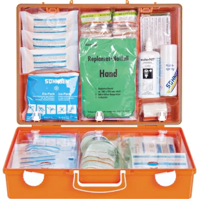 Sterile Verbandstoffe von SÖHNGEN® sind mit dem Herstellungsdatum und einem Haltbarkeitsdatum von 20 Jahren ab Herstellung versehen. 5 Jahre Garantie auf alle beweglichen Funktionsteile (wie Tragegriffe, Drehverschlüsse, Scharnierlaschen, Stecklaschen für Abdeckplatten) sowie Farbgleichheit der Koffer! Ausrichtung der Wandhalterung mit 90°-Stopp-Arretierung. Für Betriebsverbandkästen plus eine individuell berufsrisikobezogene Erweiterung.