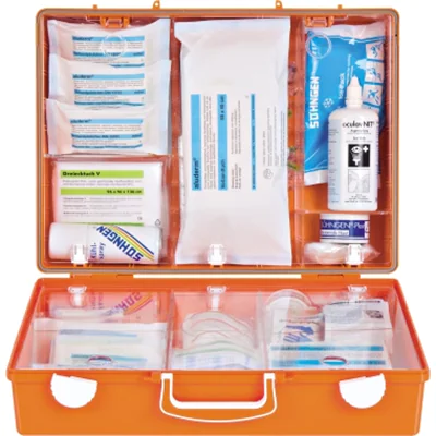 Sterile Verbandstoffe von SÖHNGEN® sind mit dem Herstellungsdatum und einem Haltbarkeitsdatum von 20 Jahren ab Herstellung versehen. 5 Jahre Garantie auf alle beweglichen Funktionsteile (wie Tragegriffe, Drehverschlüsse, Scharnierlaschen, Stecklaschen für Abdeckplatten) sowie Farbgleichheit der Koffer! Ausrichtung der Wandhalterung mit 90°-Stopp-Arretierung. Für Betriebsverbandkästen plus eine individuell berufsrisikobezogene Erweiterung.