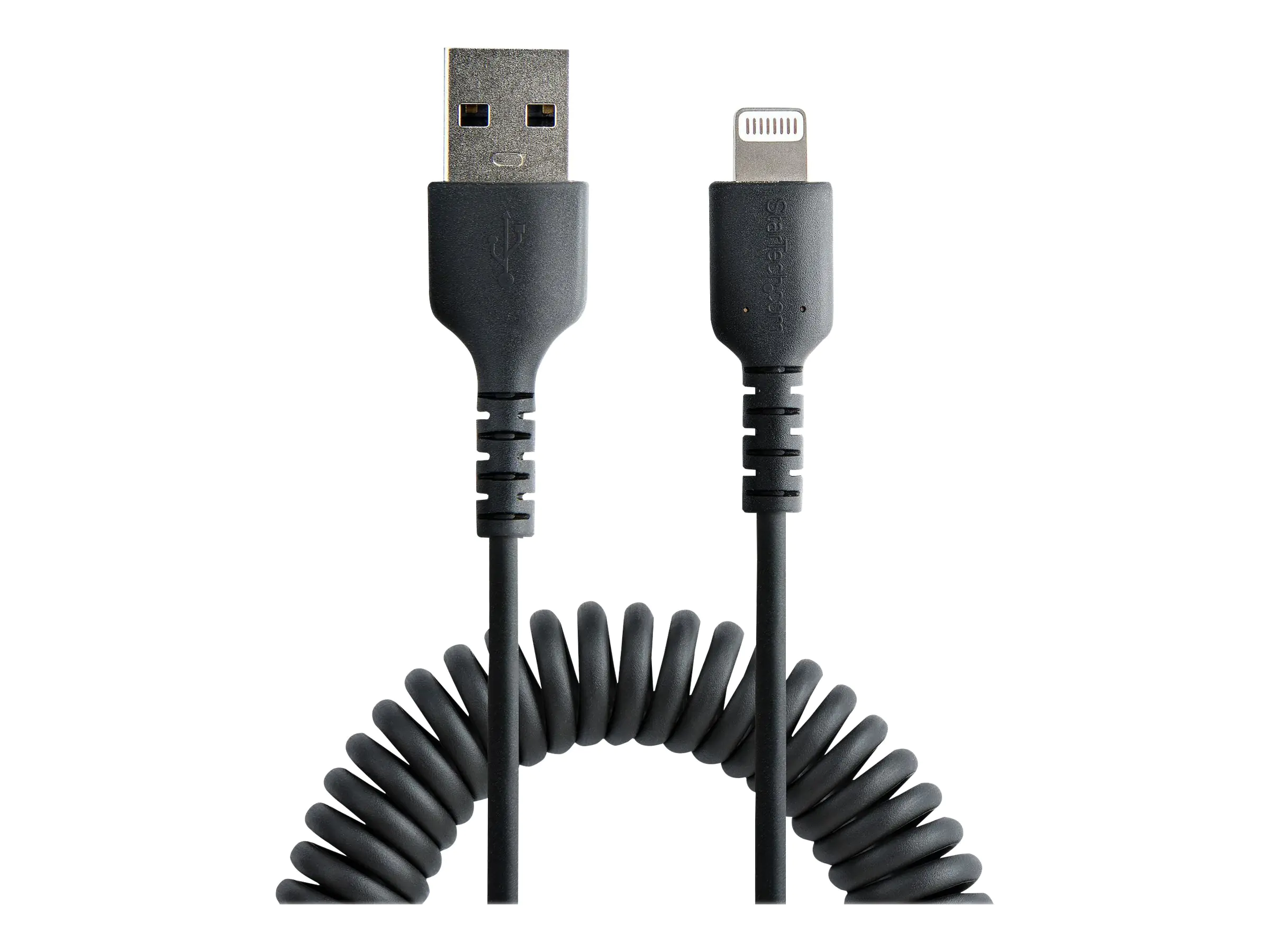 StarTech.com 1m (3ft) USB to Lightning Cable, MFi Certified, Coiled iPhone Charger Cable, Black, Durable and Flexible TPE Jacket Aramid Fiber, Heavy Duty Coil Charging Cable - Rugged USB Lightning Cable (RUSB2ALT1MBC) - Lightning-Kabel - USB männlich zu Lightning männlich - 1 m - Schwarz - gewickelt - für Apple iPad/iPhone/iPod (Lightning)