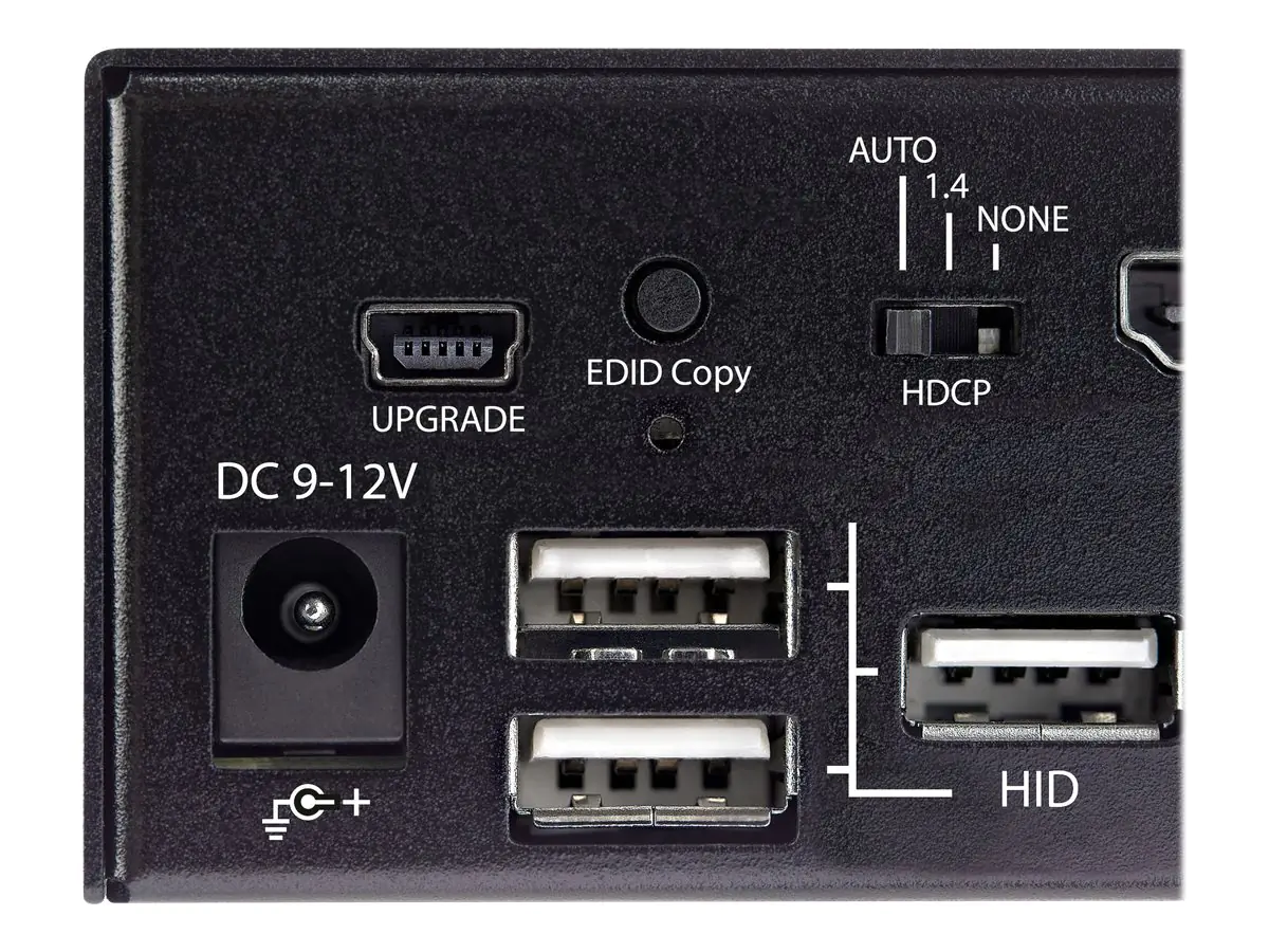 - TECHNISCHE DATEN: HDMI 2.0 mit vier Anschlüssen | 3840 x 2160 | HDCP 2.2 | HDR10 Unterstützung |USB 3.0 Hub (5 Gbp/s) mit 2 Anschlüssen | 4x USB HID | Tastenkombinationen, einzelne Tasten | Stereo Analog + 7.1 Digital Audio | EDID & HDCP Emulation | betriebssystemunabhängig