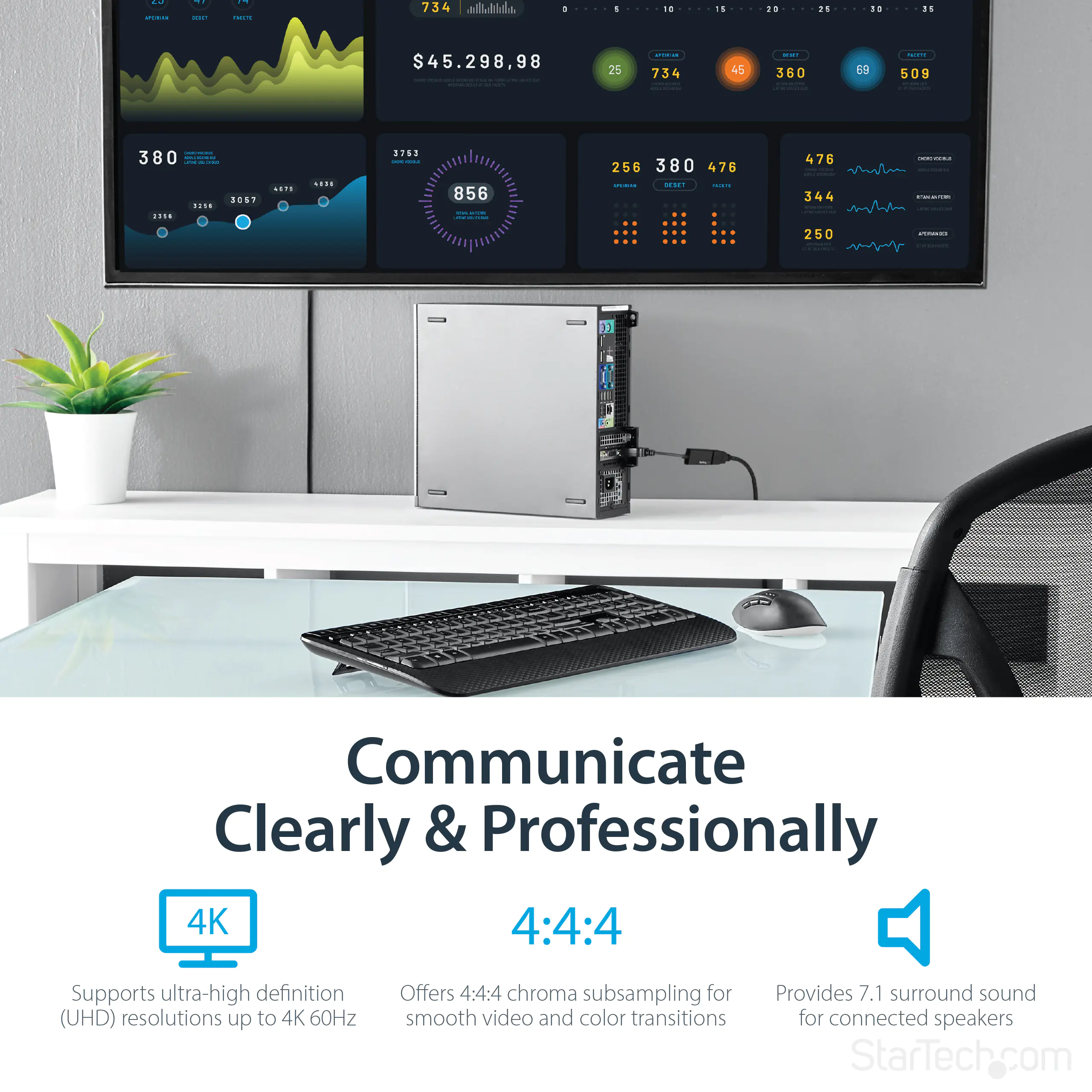 Mit diesem Adapter nutzen Sie die eingebauten Videofunktionen Ihrer DisplayPort -Verbindung zur Ausgabe der erstaunlichen UHD-Qualität auf Ihrem 4K 60 Hz-Display. Dies erleichtert Ihnen die gleichzeitige Nutzung mehrerer Monitore bei der Arbeit mit ressourcenintensiven Anwendungen.