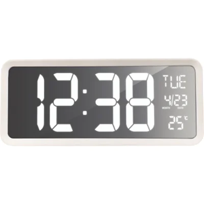 Datums- und Wochentagsanzeige (3 Sprachen). Dimm-Sensor. Dauerbeleuchtung nur mit Netzteil. Großes Spiegel-Display. Wandaufhängung oder Tischaufstellung.