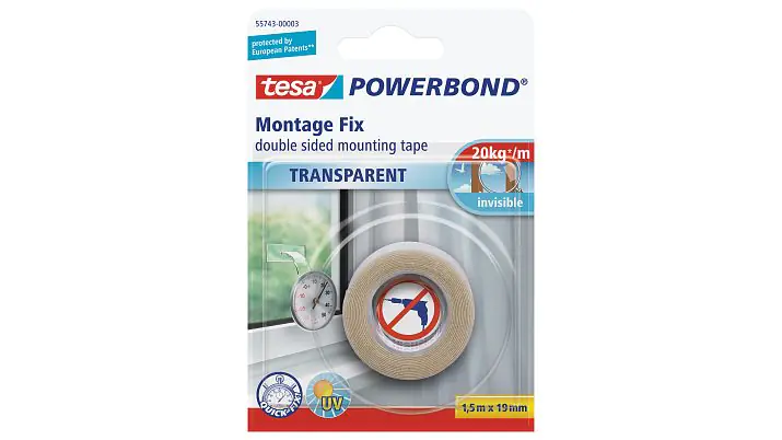 Das transparente tesa Powerbond® Montageband ist besonders dünn und klebt unsichtbar. Individuell zuschneidbar. Hält bis zu 2 kg pro 10 cm Montageband (bei flachen Objekten bis 10 mm Tiefe und auf den meisten glatten, ausreichend festen Oberflächen).
