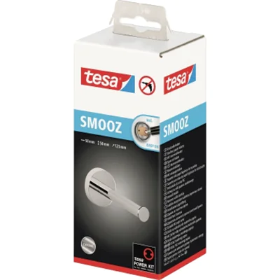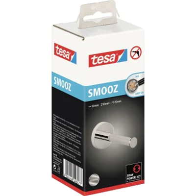 Mit dem tesa® SMOOZ Toilettenpapier-Ersatzrollenhalter vermeiden Sie Situationen, in denen eine Toillettenpapierrolle fehlt. Er lässt sich in Ihrem Bad / Gäste-WC bequem ohne Bohren anbringen. Da Sie ihn jederzeit entfernen können, bleiben Ihre Fliesen unbeschädigt. Die Klebmasse, mit der Sie den Befestigungsadapter füllen, entfaltet nach 12 Stunden die maximale Haltekraft von bis zu 6 kg. Mit einem neuen Adapter (BK20) lässt sich der Ersatzrollenhalter wiederverwenden. Für ihn spricht außerdem ein elegantes Design, bei dem runde Formen und glänzende Oberflächen harmonieren.