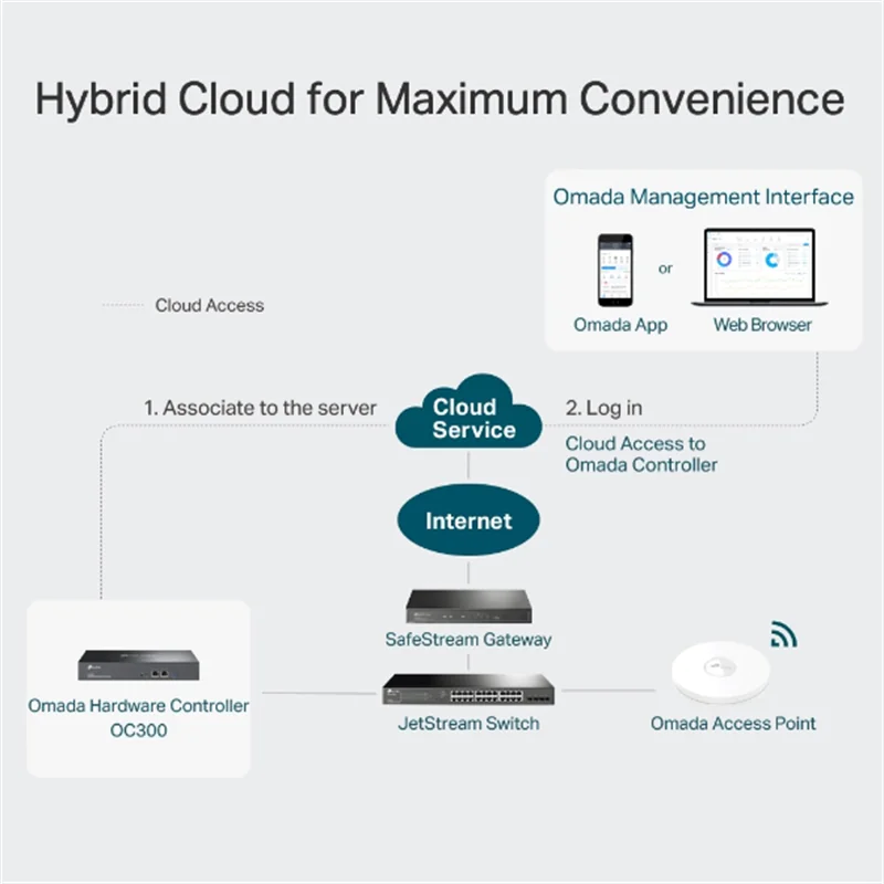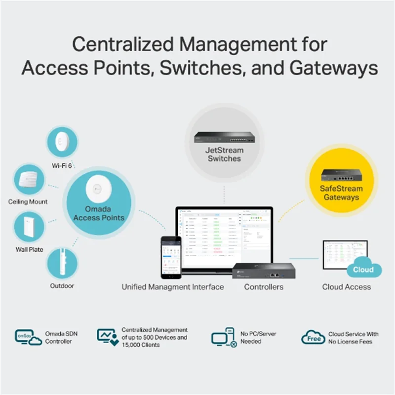 - Zentralisiertes Management für bis zu 500 Omada-Accesspoints, Omada-JetStream Switches und Omada-SafeStream Router bzw. Omada-Gateways
