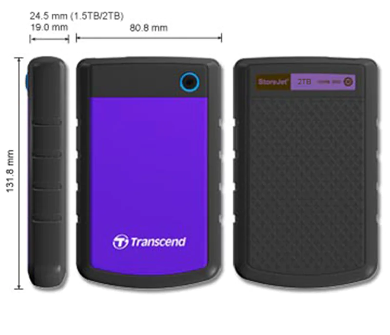 Das StoreJet 25H3P hat ein rutschfestes Gehäuse in der Farbe Lila, einen verstärkten Festplattenrahmen, der die Stöße gleichmäßig verteilt und einen internen Festplattenfederungsdämpfer. Es ist mit einer komfortablen One Touch Auto-Datensicherungstaste ausgestattet, mit der Sie umgehend eine Datensicherung und Synchronisation mit Ihrem Computer durchführen können.