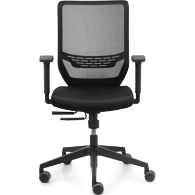 Bürodrehstuhl mit Armlehnen. Hohe Netz-Rückenlehne, mit höhenverstellbarer Lumbalstütze. Synchron-Mechanik mit 3fach arretierbarer Synchronbewegung und stufenlos arretierbarer Federkraftverstellung (frontal) mit großem Öffnungswinkel. Sitz gepolstert. Atmungsaktiver Formschaum (PU), FCKW- und CKW-frei geschäumt. Alle Kunststoffteile sind sortenrein, PVC-frei und recyclingfähig. Lastabhängig gebremste Doppellaufrollen. Armlehnen 10 cm höhen- und 6 cm breitenverstellbar.