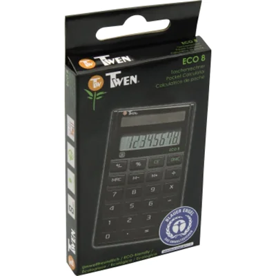 Mit dem Twen Eco 8 können Sie mit ruhigem Gewissen rechnen - der Solarrechner wird aus 70 % recycelten Materialien hergestellt und schont durch den reinen Solarbetrieb mit seiner leistungsfähigen Solarzelle zusätzlich die Umwelt. Neben den Grundrechenarten bietet er weitere Funktionen. Große Solarzelle für sicheren Betrieb auch bei schlechten Lichtverhältnissen.