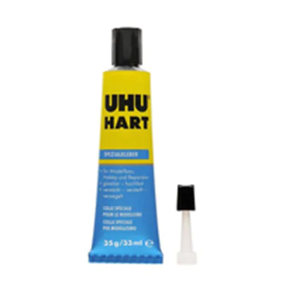 UHU® HART ist ein glasklarer, schnelltrocknender und schnellhärtender Spezialkleber für Kleinteil-Verklebungen beim Basteln, beim Modellbau und im Haushalt. Trocknet hart auf, daher ideal zum Verstärken kritischer Klebestellen sowie zum Versteifen und Versiegeln vieler Materialoberflächen. Mit separater Feindosierspitze.