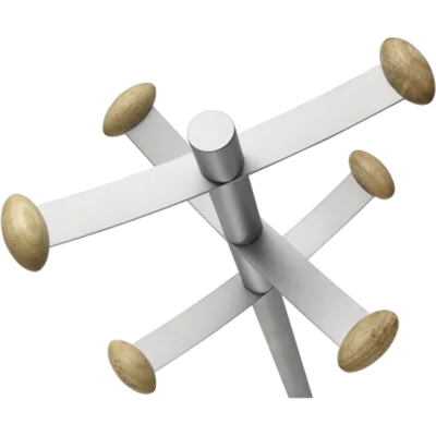 Kleiderhaken mit Köpfen aus Holz sorgen beim Garderobenständer BOUQUET für eine leichte und moderne Optik. Durch die versetzte Anordnung der Haken hängen Jacken und Mäntel nicht übereinander. Ein robuster Stahlfuß sorgt auch in Durchgangsbereichen für einen sicheren Stand. Hochwertiger Stahl gibt BOUQUET eine leichte Optik. Die hölzernen Kleiderhaken haben eine breite runde Form und schonen damit die aufgehängten Kleidungsstücke. Dieser Garderobenständer lässt sich schnell und einfach aufbauen.