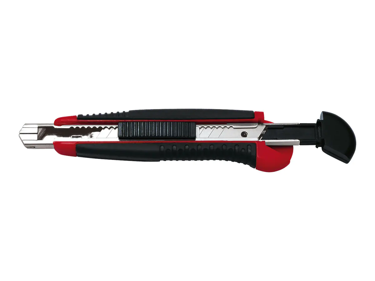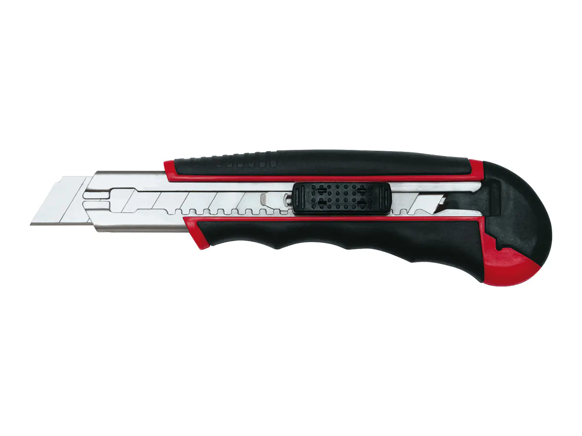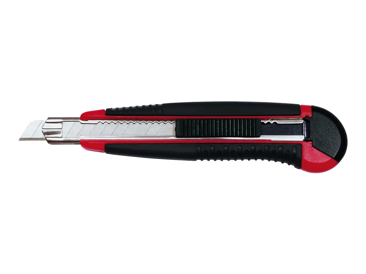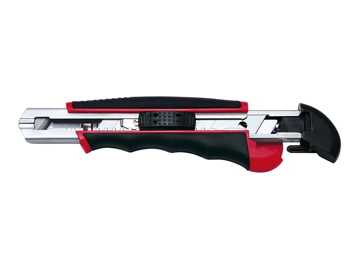 Mit automatischem Klingentausch aus integriertem Magazin. Klingenführung aus Metall. Mit Rastervorschub und Auto-Stop. Durch das erneute Zurück- und Vorschieben ist die neue Klinge automatisch geladen.