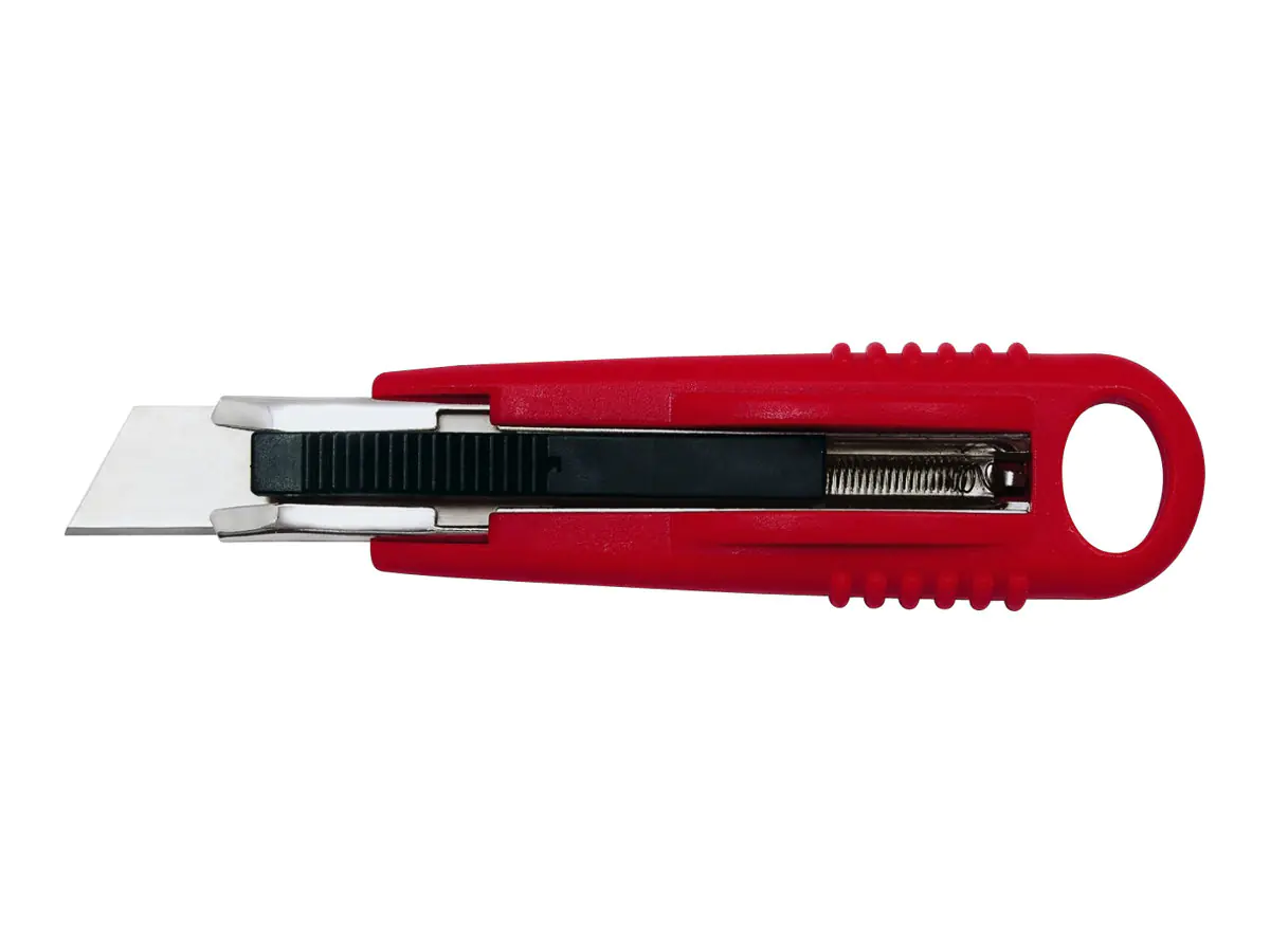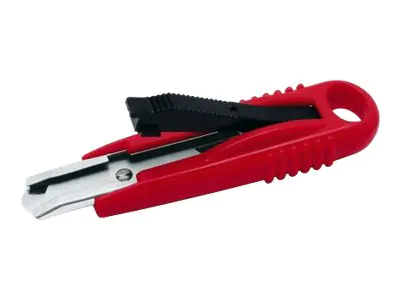 Griffkörper mit genoppter Auflage auf der Rückseite. Die Klinge ist federbelastet und verschwindet automatisch im Griff, wenn das Messer vom Schneidegut abrutscht (Schieber während des Schneidens nicht festhalten). Leichter Klingenwechsel ohne Hilfsmittel durch Vorschieben und Zurückklappen des Schiebers. Durch umstecken der Klinge auch für Linkshänder geeignet.