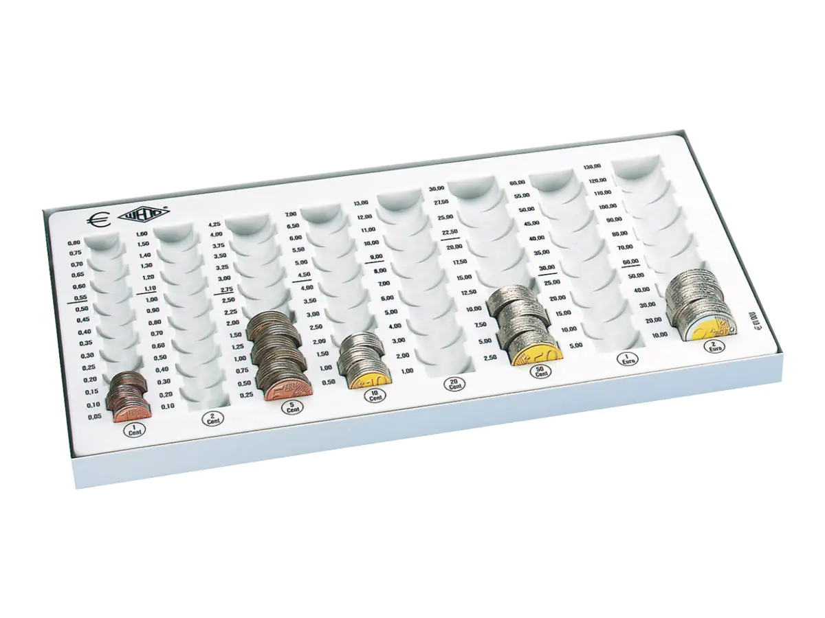 WEDO Hartgeld-Zählbrett (EURO) aus Polystyrol, eingefaßt in einem Metallrahmen aus Stahlblech mit kratzfester Pulverlackierung. Unentbehrlich für alle, die viel mit Münzgeld zu tun haben. Die Münzräume gewährleisten einen leicht abzulesenden Kassenbestand und halten Ordnung in der Schublade, mit 4 rutschfesten Gummifüßen.
