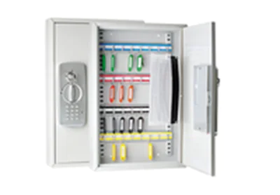Die neuen Schlüsselschränke sind mit einem elektronischen Drehzahlenschloss ausgestattet, das per Benutzercode (3- bis 8-stellig) leicht programmierbar ist. Damit kann auch einer größeren Anzahl von Nutzern der Zugriff gewährt und jederzeit korrigiert werden, ohne dass weitere Schlüssel notwendig sind. Über das zusätzlich eingebaute Zylinderschloss können die Schlüsselschränke im Notfall auch mechanisch geöffnet werden. Zwei nummerierte Schlüssel werden mitgeliefert. Ausgestattet mit vier verstellbaren Hakenleisten, die dem Fassungsvermögen entsprechend nummeriert sind. Das schwenkbare Schlüsselregister sorgt für einen guten Überblick.